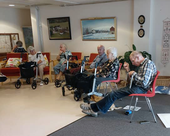 Arne Hornsletten og hunden Bella besøker beboere på Sætre alders- og sykehjem