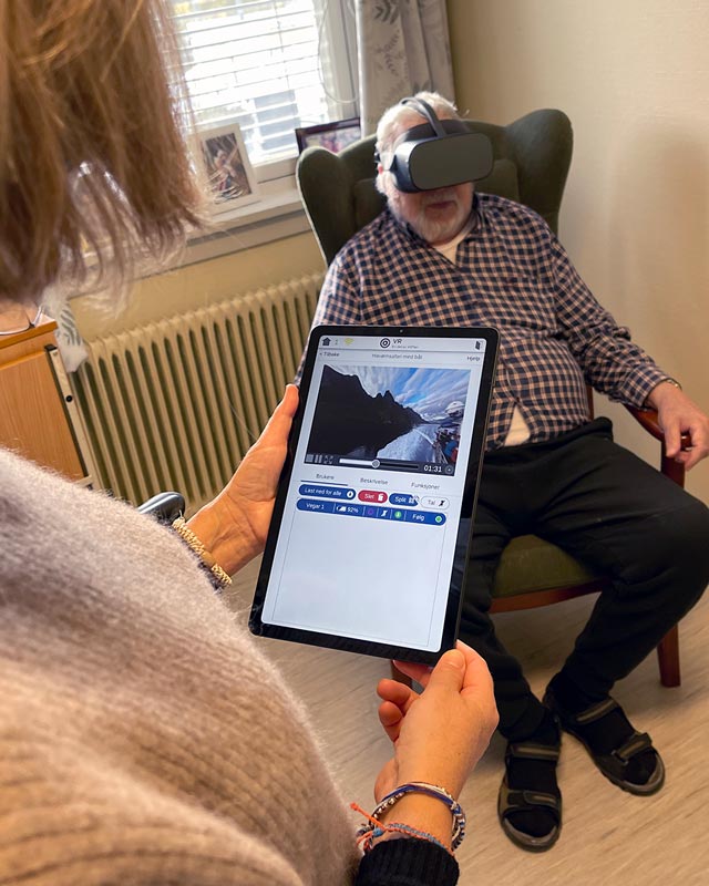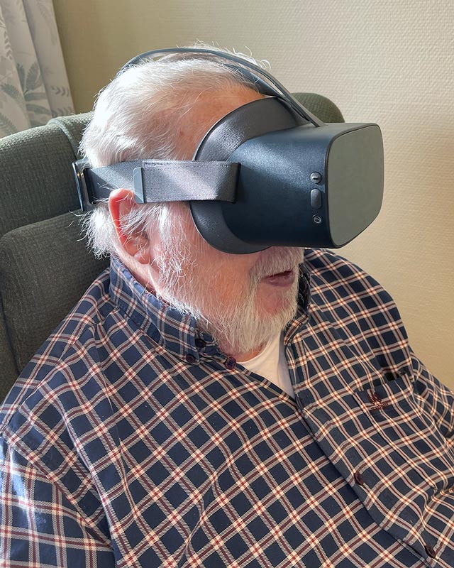 På Gimle sykehjem fikk de teste VR-opplevelser. Dette syns de var en fantastisk opplevelse. Ved at man kan følge med på skjermen for å se hva beboeren ser i VR-brillen, er det lettere å dele opplevelsen og gleden sammen. Slik blir det mange gode samtaler!