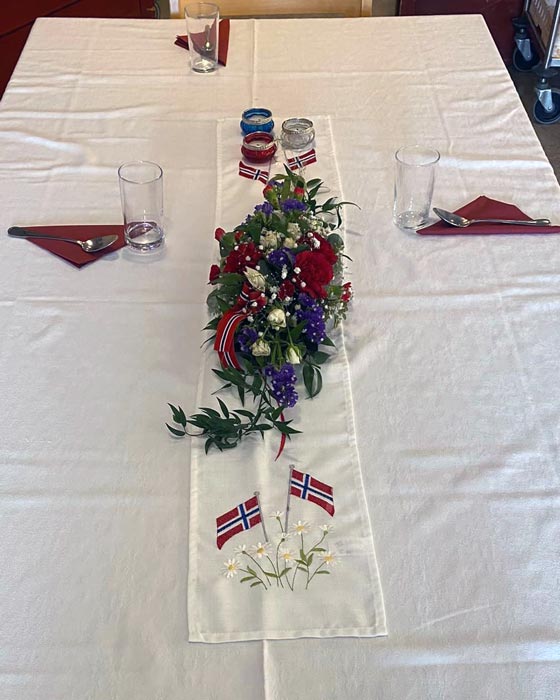 Takket være blomsterbutikken var bordene lekkert pyntet til 1. mai-feiringen på søndag. Veldig fint gjort!
