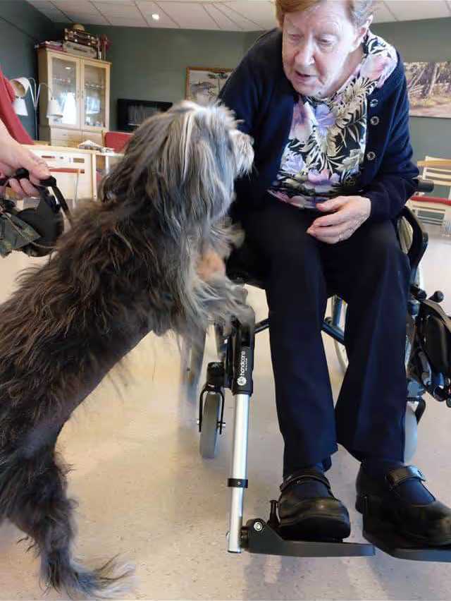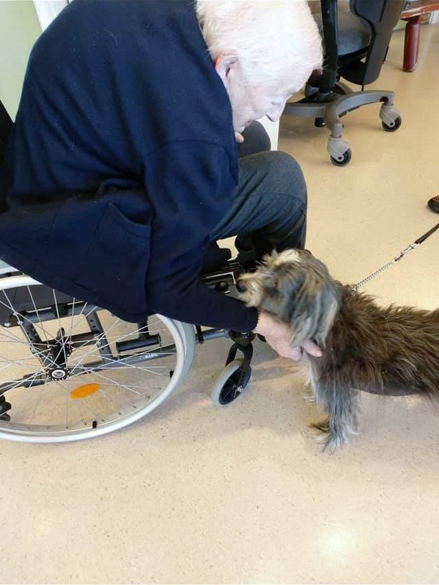 "Det var stor stas for brukerene her på huset", skriver ansatt Trude Vikløkken i sitt innlegg i Facebook-gruppen VilMer Elverum. Gunn Helen Reiten og hunden hennes Zippo besøkte beboerne på Sætre alders-og sykehjem, til stor glede for alle sammen.