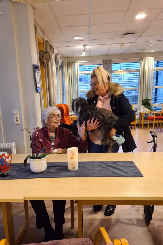Den logrende hunden Zippo var så heldig å få besøke Moen sykehjem sammen med matmor Gunn Helen Reiten på tirsdag. Beboerne syntes det var veldig koselig å få kose og klappe på Zippo. Flott gjort av Gunn Helen!
