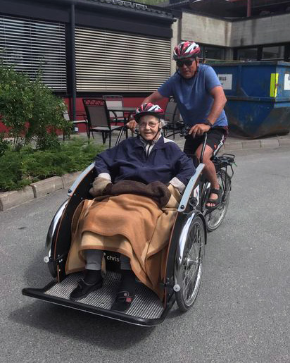 I helgen var Helge Helgesen på ukens femte elsykkeltur med beboere fra Brumunddal sykehjem. Det er lett å se at dette gleder både passasjerene og sjåføren selv.