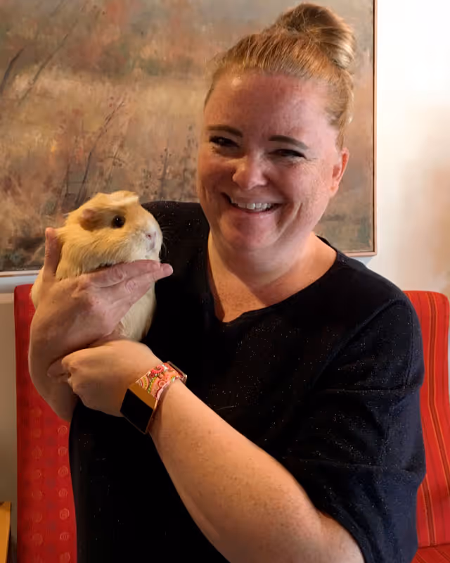 Torunn Mjelde besøkte i går beboerne på Brumunddal bo- og aktivitetssenter. Med seg hadde hun marsvinene Elvira og Dina som oppførte seg eksemplarisk overfor beboerne. Både beboere og ansatte gledet seg til marsvinbesøk, og som vanlig tok Torunn seg god tid til samtaler, og alle som ville fikk ha marsvin på fanget for kos og omsorg.