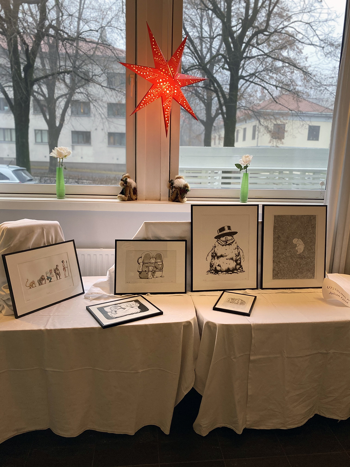 Tusen takk til kunstner Julian Fjeld som har stilt ut kunsten sin på St. Hanshaugen omsorgssenter. Beboere, pårørende og ansatte har gjennom julen kunnet glede seg med humoristisk kunst.