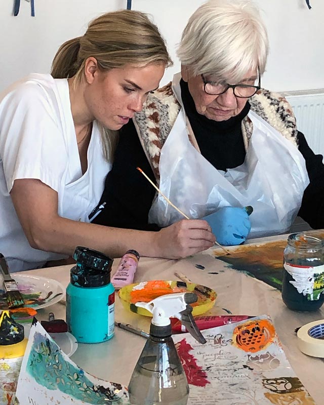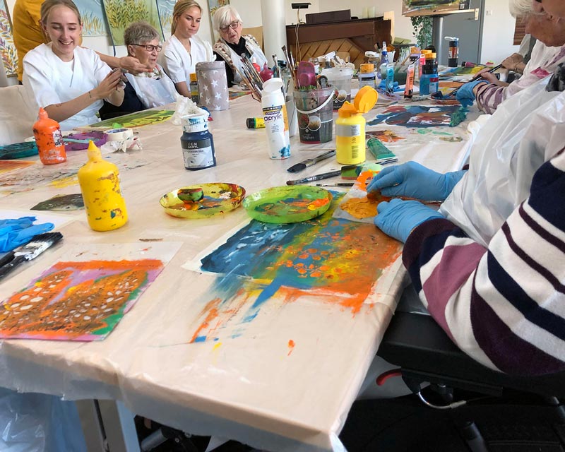 Når Kerstin Birkheim kommer på besøk, blir det alltid en formiddag full av spøk, latter og kreativ utfoldelse. Besøket på Jotunhaugen på mandag var av akkurat samme slaget. Beboerne malte fargefulle høstbilder med det som var tilgjengelig av redskaper - kredittkort, stekespade og svamper. Virkelig flott, Kerstin.