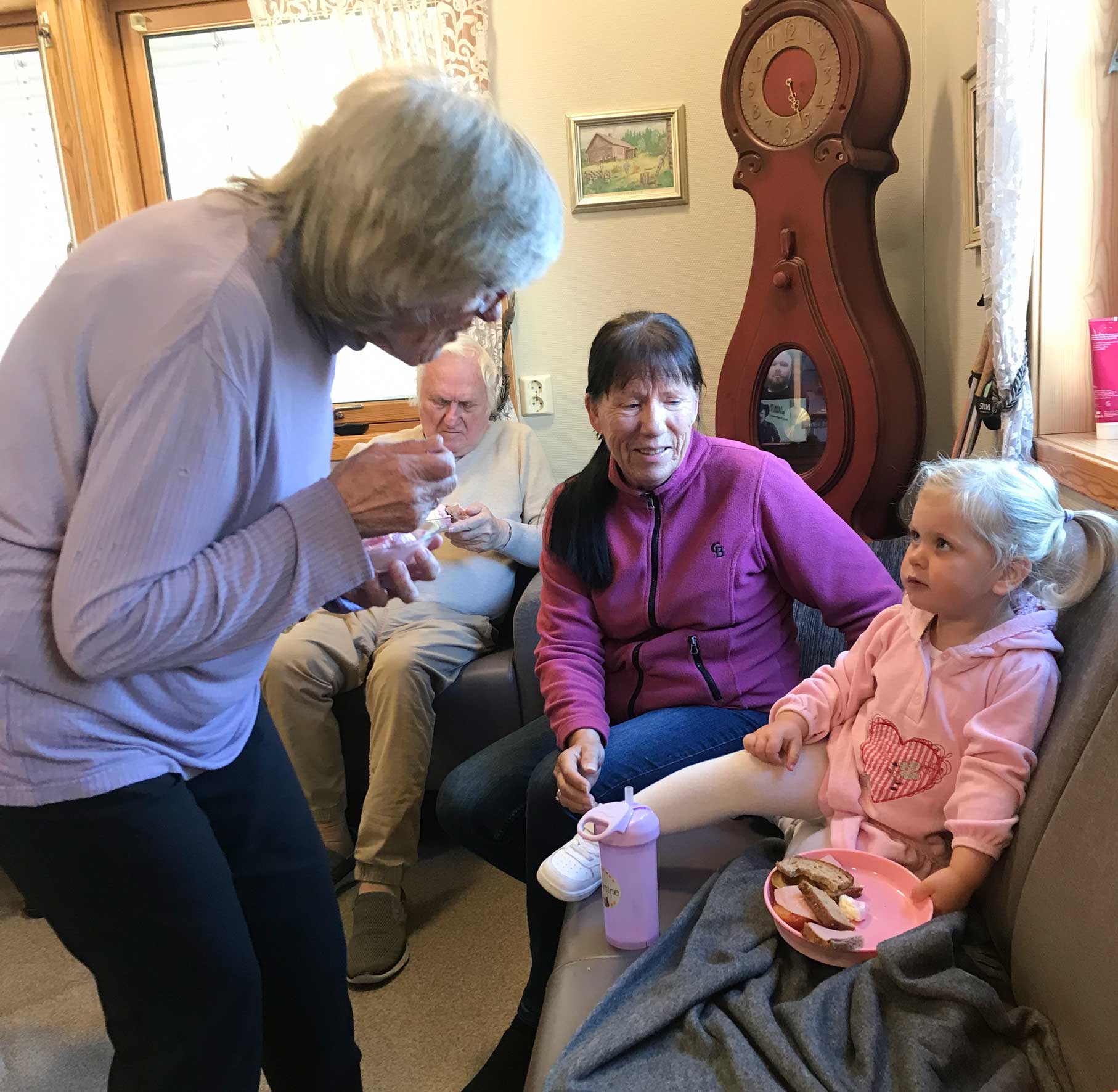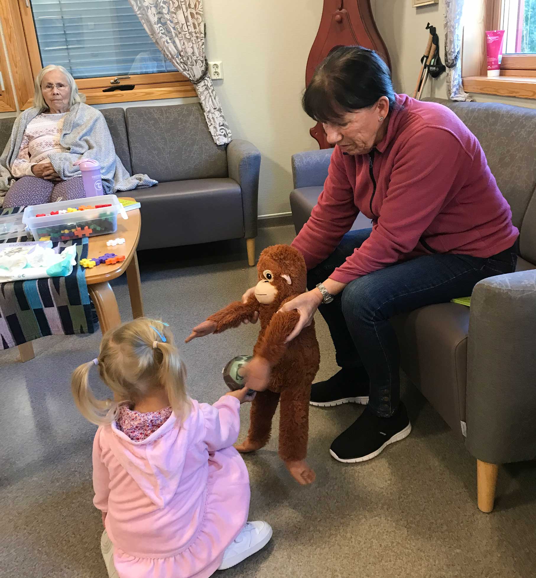 Lille Martine sjarmerte alle beboerne i senk da hun og moren Kristin Sveen besøkte Lyngholtet sykehjem i går. Det ble et koselig på besøk med både lek og sang, og alle fikk is. En koselig stund for både store og små.
