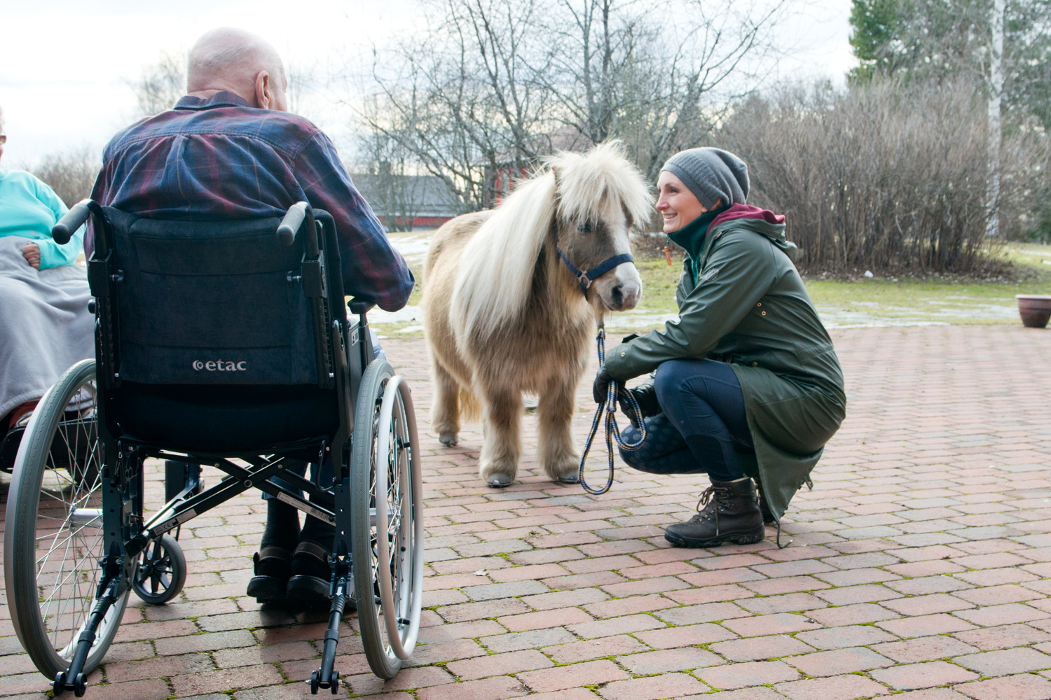 «Oi, det var jammen meg en fin en!» Ponnien Linus stortrivdes med all oppmerksomheten han fikk under tirsdagens besøk på flere avdelinger på Løten helsetun med eier Christina Flikkeid Nedreberg fra Vealund gård.