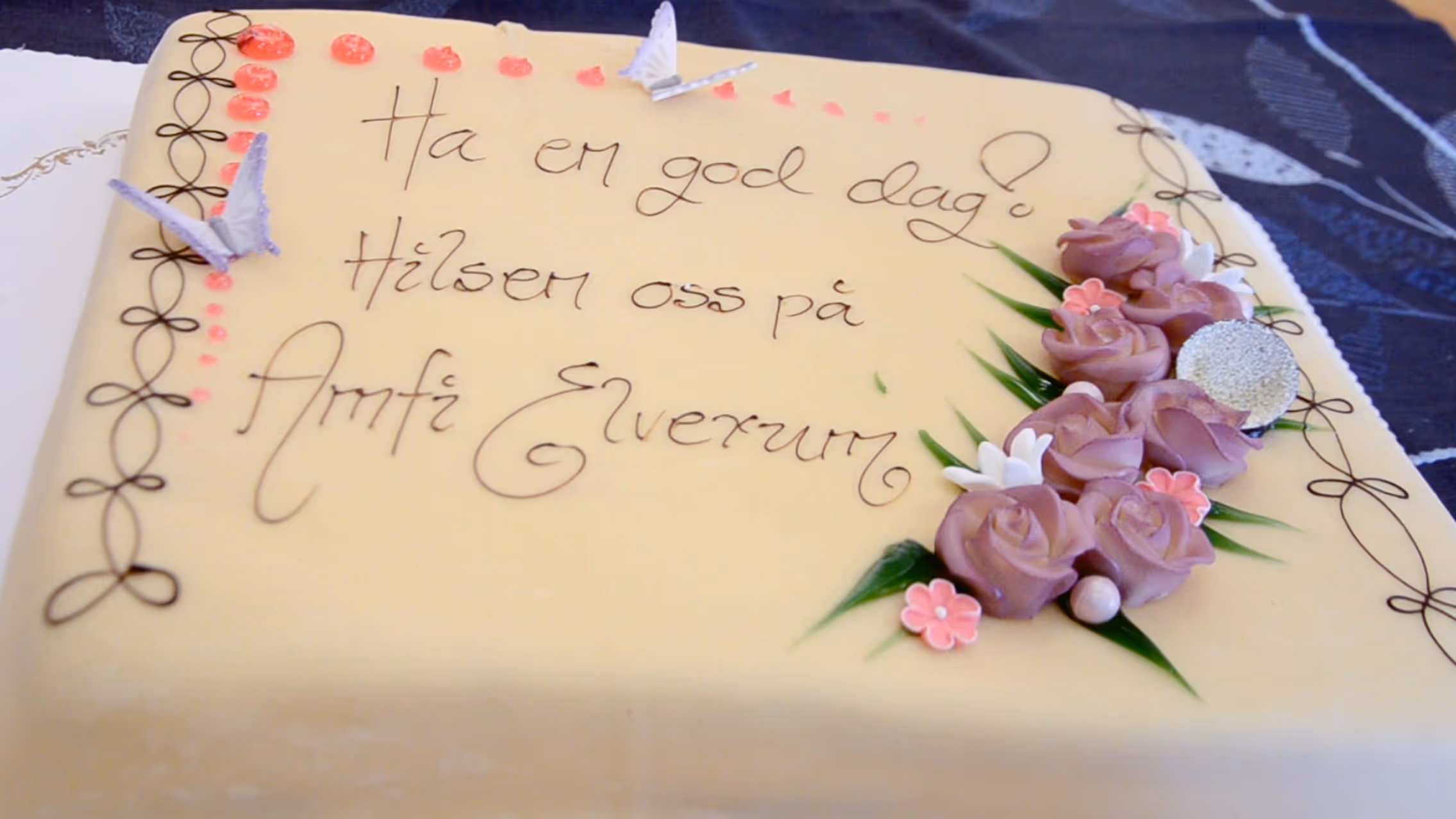 Takk AMFI Elverum! På fredag hadde Lene Faraasen nok en gang med seg en smakfull og pent dekorert marsipankake til stor glede for beboerne på Lyngholtet, og det ble god stemning på stua!