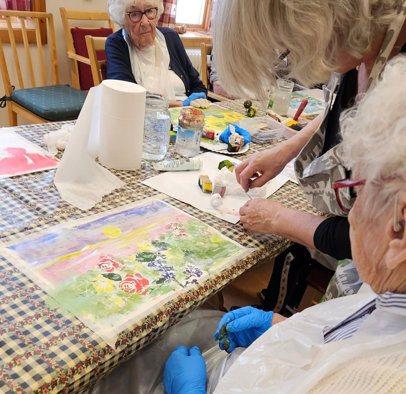 Det var både glede, latter og kreativ utfoldelse på avdelingen da Kerstin Birkheim besøkte Sætre alders- og sykehjem i går. Beboerne lot fantasien løpe fritt mens de malte fargerike kunstverk, og eksperimenterte med ulike teknikker ved hjelp av uvanlige redskaper som kredittkort og svamper.