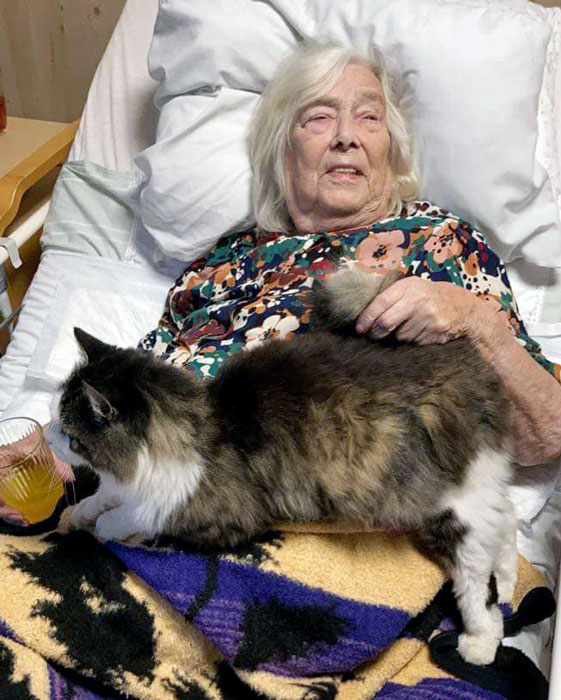 Kristin Moshagen og katten hennes Messi besøkte søndag beboerne på avdeling Rognlia på Hovlitunet. Det var til stor glede for beboerne som savner sine egne kjæledyr.