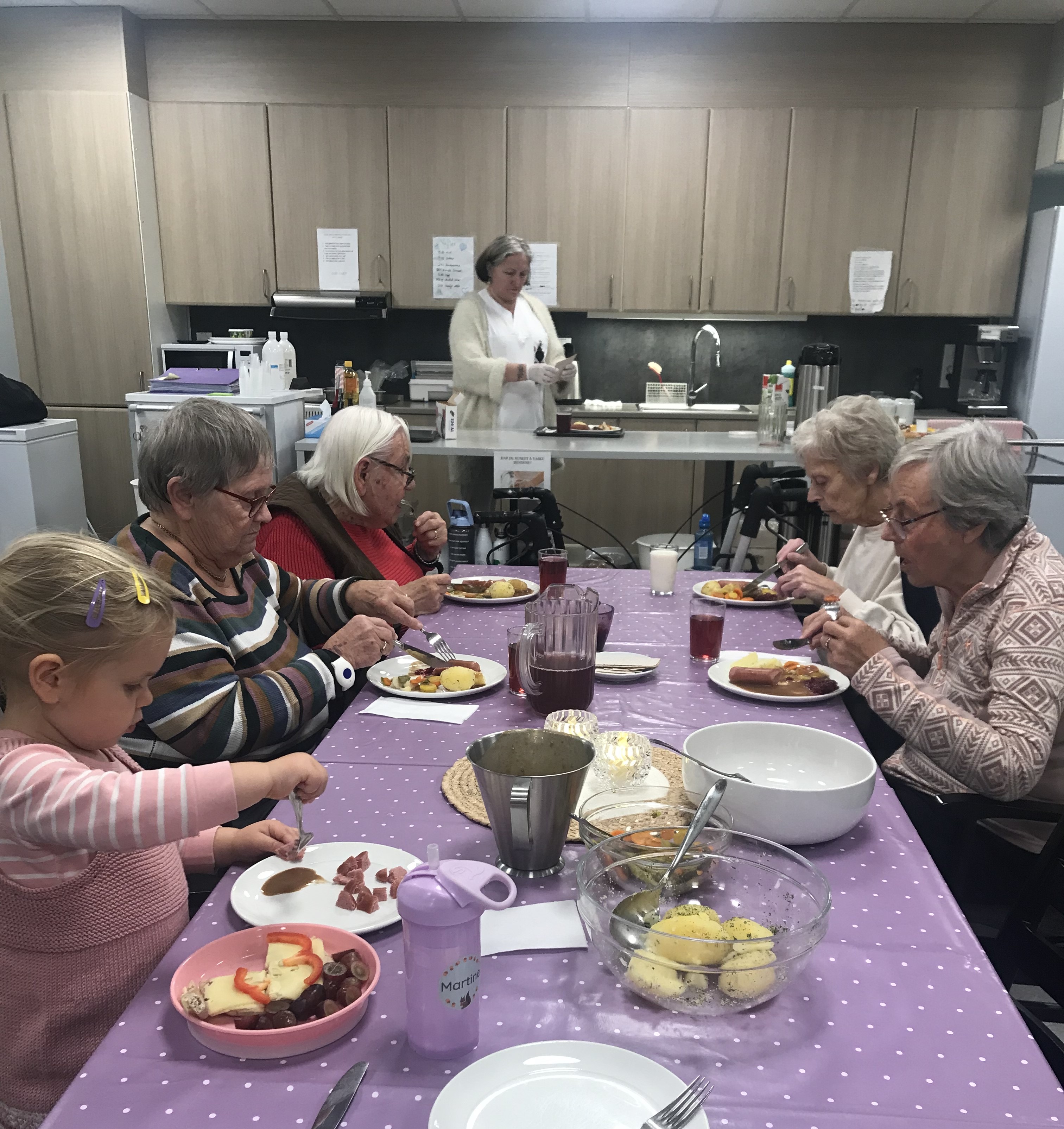 Det ble en koselig stund på Jotuntoppen da lille Martine og mamma Kristin Sveen besøkte beboerne på tirsdag. De spiste middag sammen, og etterpå ble det tid til både ballspill, tegnestund, gåtur i gangen og kosing med kaninen Nusse. Et herlig generasjonsmøte!