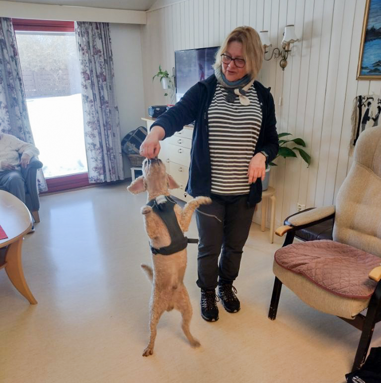 Kristina Sundblom og hunden Bobbi besøker Løten helsetun