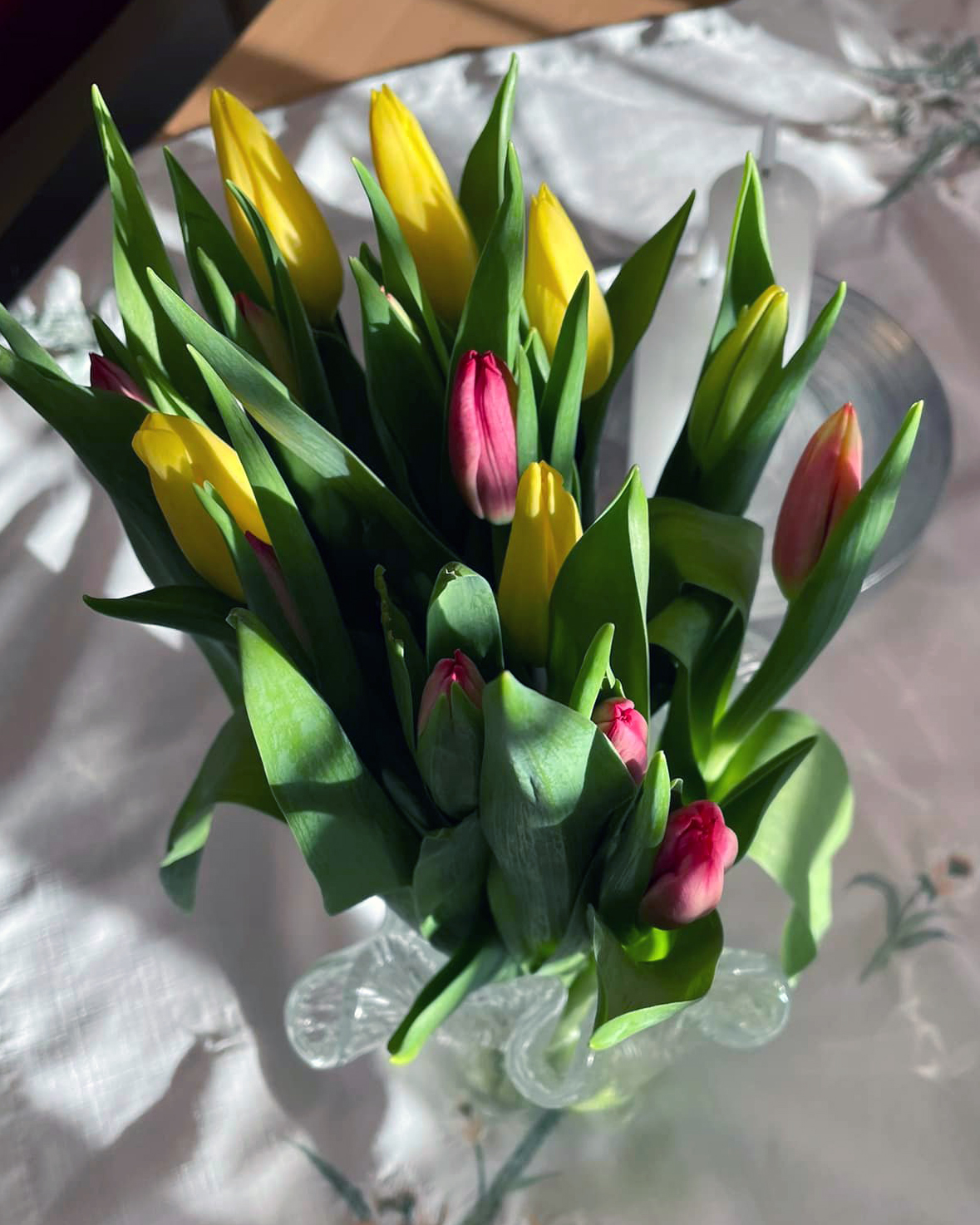 Lørdag formiddag leverte Mona Vandraas to nydelige kaker, ferske kanelsnurrer og en bukett med tulipaner til alle på Åslundmarka bokollektiv. Takket være rause Mona fikk alle godt med bakst til kaffen, og helgen ble komplett. Utrolig flott gjort av Mona, nok en gang!