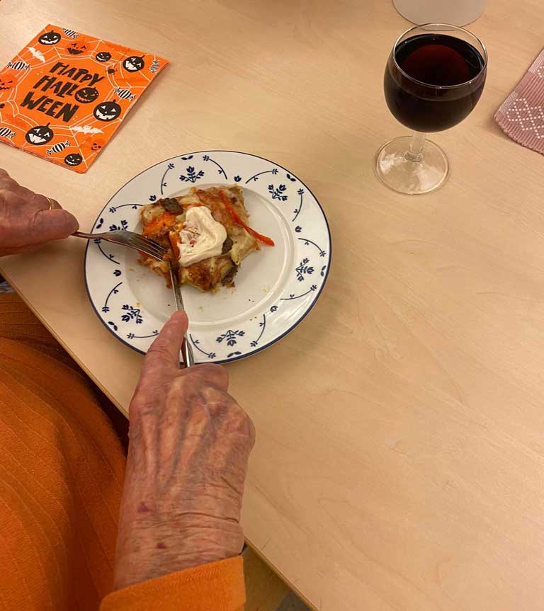 "Halloween feiring på Sætre sykehjem med pizza spandert fra Peppes Pizza og muffins som personalet har bakt å pyntet. Beboerne koste seg med serveringen og pyntede omgivelser. Stor takk til Peppes Pizza for gode pizzaer", skriver Ole-Harald Berg i Facebook-gruppen VilMer Elverum.
