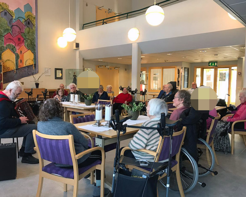 "En kjempekoselig formiddag på Moen sykehjem i dag. Det ble trekkspill og sang", skriver ansatt Jennifer Espanola i Facebook-gruppen VilMer Elverum. Onsdag formiddag samlet mange beboere seg i storstuen da Roar Moe kom på besøk med trekkspillet sitt. Sammen lyttet alle til musikken og trampet i takt.