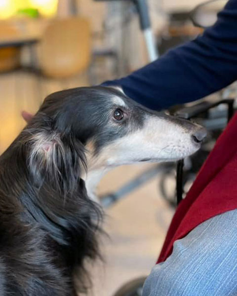 Samantha Silva og hunden Samuel besøkte fredag formiddag beboerne på Dragvoll helse- og velferdssenter. Samuel sjarmerte med sitt rolige vesen og fikk mye kos fra alle han hilste på.