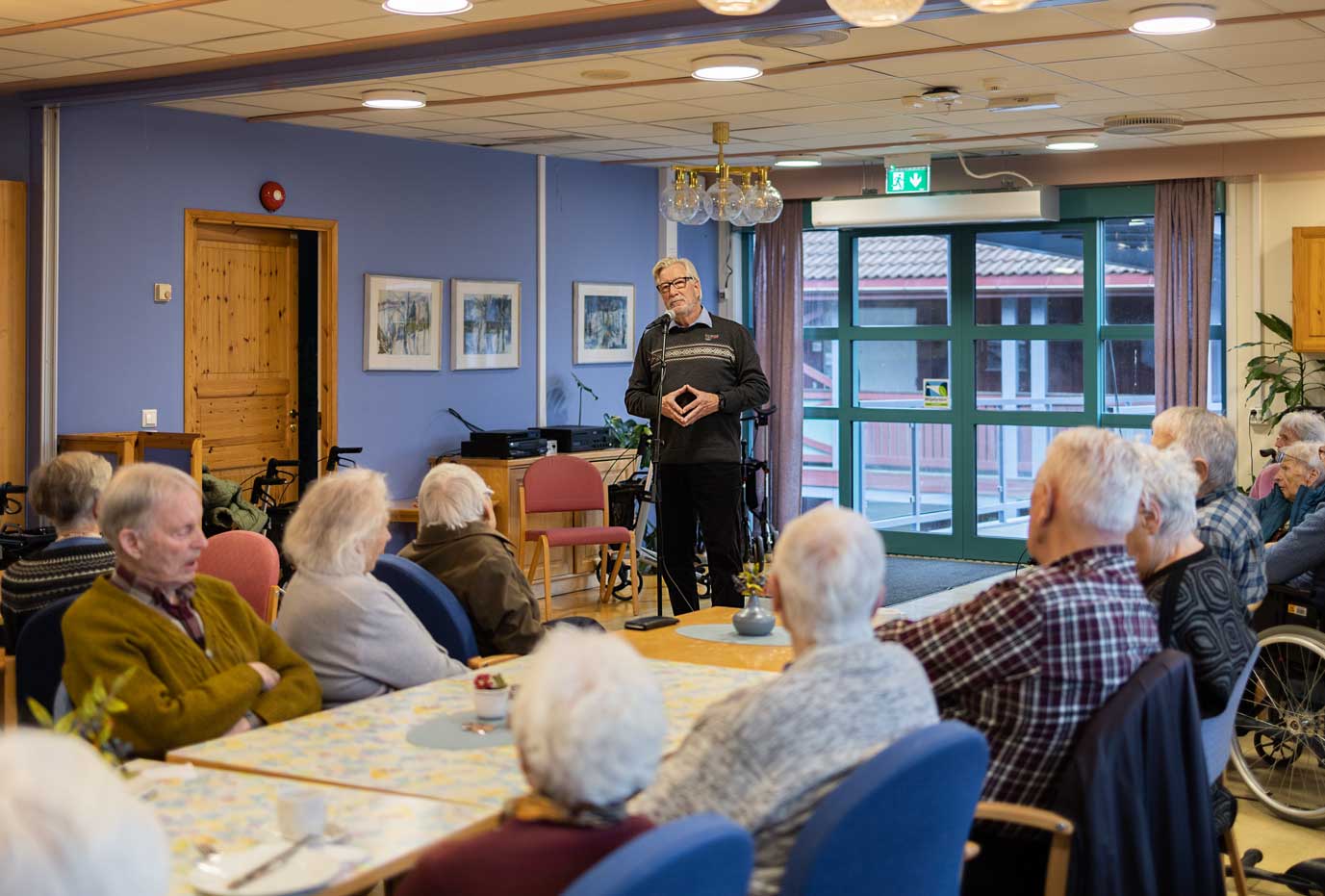 Sigbjørn Johnsen sto for underholdningen til kaffen på Søre Ål bo- og servicesenter på onsdag. Det kom publikum fra alle bo- og servicesentrene i Lillehammer: Busmoen, Skårseterlia, Garnerhagen, Søre-Ål og Horsters Minde. Det ble et fint arrangement med gode historier som brakte frem minner fra gamledager og en god latter.