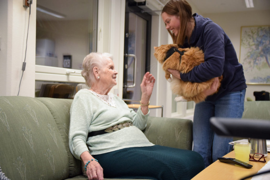 Thea Stenbakken Gustavsen og Alfred har blitt stamgjester i 4. etasje på Brumunddal sykehjem, og på tirsdag lyste beboerne opp når Alfred igjen besøkte fangene deres.