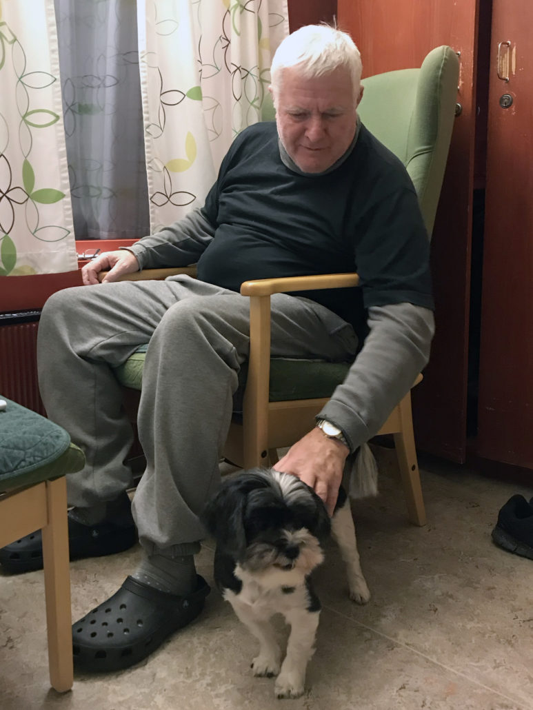 «En sånn hund skulle vi hatt her fast». Hunden Tiril fikk mye kos og oppmerksomhet da hun tirsdag hilste på beboerne på post 2 på Løten helsetun sammen med matmor Ida Torp. Idas yngstedatter på 4 år var også med til glede for alle sammen.