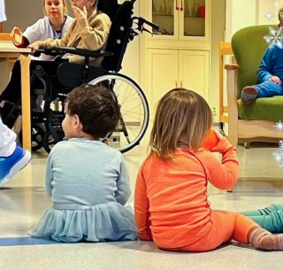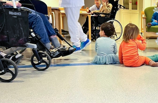 Det ble et fint generasjonsmøte da barna fra Norbana barnehage besøkte beboerne på Gartnerhagen bofellesskap på tirsdag. Barna hadde med tog og togbane som de lekte med på gulvet, og viste frem sanger og regler som de har lært. Koselig gjort av Norbana barnehage!